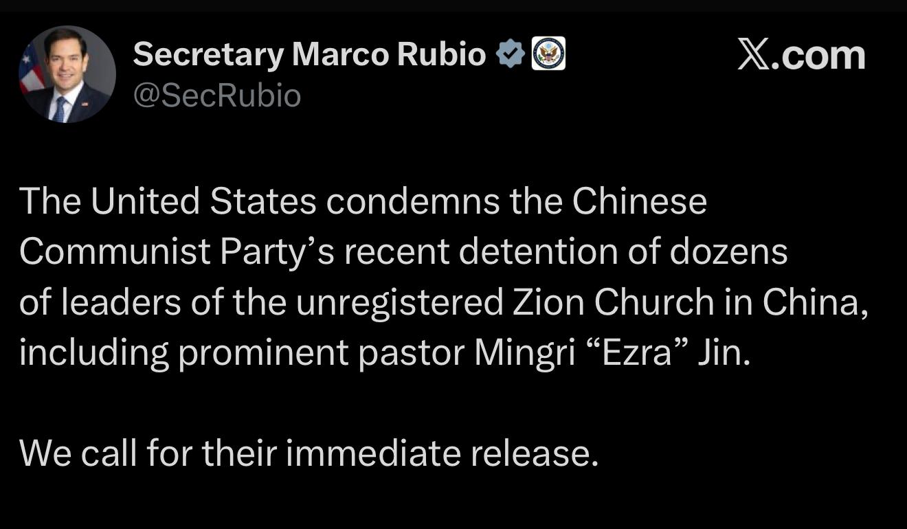 “Çin Komünist Partisi’nin kayıt dışı Zion Kilisesi liderlerini, tanınmış pastör Mingri ‘Ezra’ Jin dâhil olmak üzere tutuklamasını kınıyoruz. Tümünün derhal serbest bırakılmasını talep ediyoruz,”
